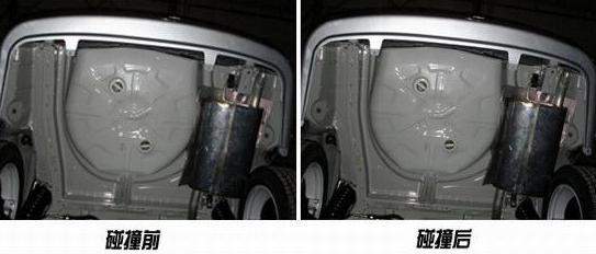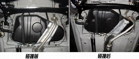 碰撞后,在車廂底部排氣管有稍微變形,油箱完好無損,無任何漏油現(xiàn)象。