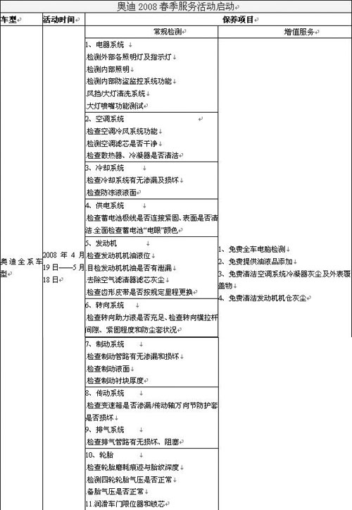 2008年4月19日,奧迪2008年春季服務(wù)活動正式啟動,通過此次活動為奧迪用戶的愛車提供最及時的維修檢測!