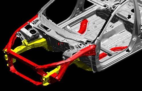 在采用“高級相容性設(shè)計車身”的同時,第八代雅閣全面提升了車身構(gòu)架中高強(qiáng)度鋼板的使用量,從上一代的13%增加到48%,特別是590號鋼材的用量相比以往提高了3倍,比重占到42%,其主要用于乘員艙(據(jù)專家介紹,590鋼板常用在坦克的側(cè)擋板中,提高碰撞性能,并有助于降低自重)。因而,整車的扭轉(zhuǎn)剛度由此比上代提高了20%,后部垂直剛度提高了33%,前懸架支撐點(diǎn)剛度提高36%。
