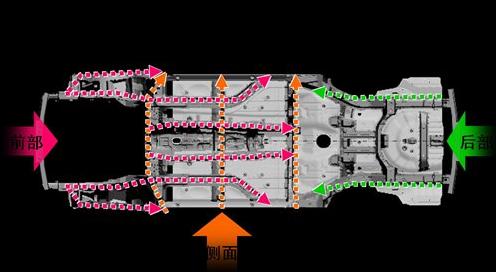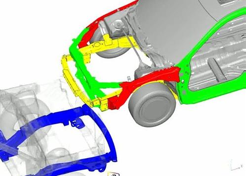 實(shí)際碰撞發(fā)生時,ACE系統(tǒng)能夠有效地將正面碰撞能量同時疏導(dǎo)至上部和下部的結(jié)構(gòu)構(gòu)件,包括底板縱梁、側(cè)門檻和A柱,使得這些正面碰撞力能夠在車輛結(jié)構(gòu)總量的一個更大比例內(nèi)進(jìn)行分配,從而更加有效地使碰撞力避開客艙,減少客艙變形,進(jìn)一步提高乘員保護(hù)。