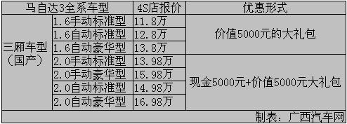 消費(fèi)者在廣西地區(qū)的長(zhǎng)安馬自達(dá)4S店內(nèi)購(gòu)買(mǎi)三廂馬自達(dá)3車(chē)型,可直接享受到相應(yīng)車(chē)型的現(xiàn)金優(yōu)惠和豐厚的大禮包,商家表示若消費(fèi)者到店詳談上述優(yōu)惠幅度還可有所增加。而一汽馬自達(dá)新近導(dǎo)入國(guó)內(nèi)上市銷(xiāo)售的進(jìn)口馬自達(dá)3車(chē)型,在廣西地區(qū)的4S店內(nèi)也出現(xiàn)了優(yōu)惠。