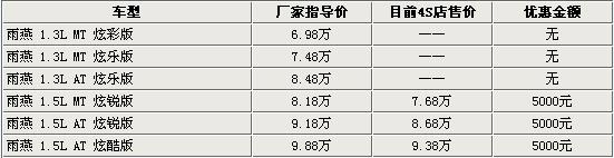 新雨燕作為長(zhǎng)安鈴木的“拳頭”產(chǎn)品,從上市至今已有一段時(shí)間了。新雨燕最大亮點(diǎn)莫過(guò)于推出了1.5車(chē)型,該車(chē)型搭載了鈴木先進(jìn)的M15A VVT發(fā)動(dòng)機(jī)。近日記者在走訪中發(fā)現(xiàn),鈴木新雨燕在價(jià)格上有了新的變化,從北京地區(qū)的長(zhǎng)安鈴木4S店了解到,目前購(gòu)買(mǎi)這款車(chē)型全系均可以得到5000元的價(jià)格優(yōu)惠。具體售價(jià)見(jiàn)下表: