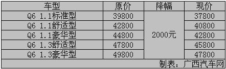 (廣西汽車網(wǎng) 訊) 昨日我們從廣西鑫廣達(dá)奇瑞經(jīng)銷商處了解到,近期QQ6的價(jià)格非常穩(wěn)定,全系優(yōu)惠2000元。以下是奇瑞QQ6最新報(bào)價(jià)表:
