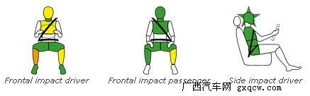 圖為碰撞時車內(nèi)駕乘人員受傷情況 三幅圖依次為正面碰撞駕駛員、副駕駛員、側(cè)面碰撞駕駛員