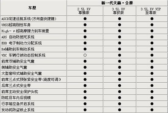 新天籟·公爵全系車型標(biāo)配了定速巡航系統(tǒng)、ABS+EBD+BA等主動安全配置,其中3.5L排量車型還增加了VDC車輛行駛動態(tài)控制系統(tǒng),提高了車輛在運(yùn)動中的安全性能。在主動安全方面,公爵系列車型全部配備了前排雙安全氣囊、側(cè)輔助安全氣囊和窗簾式輔助安全氣囊,為駕駛者提供了一個安全的駕駛環(huán)境。