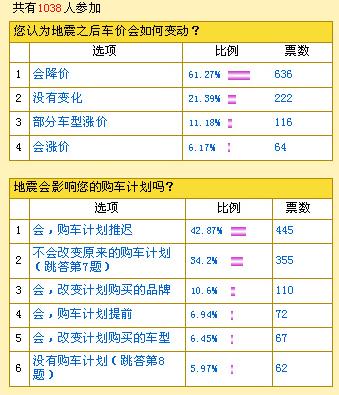 截止6月4日下午16時,有1038名網(wǎng)友參與“大地震對車市影響幾何”調(diào)查,八成以上網(wǎng)友年齡在26周歲至45周歲之間,近6成網(wǎng)友計劃在一年或半年以內(nèi)購車。據(jù)調(diào)查發(fā)現(xiàn),61.3%的網(wǎng)友肯定地震后汽車要降價,但仍有近4成網(wǎng)友認為車價不會有變化或漲價。
