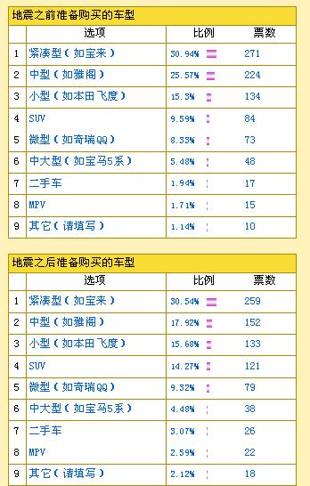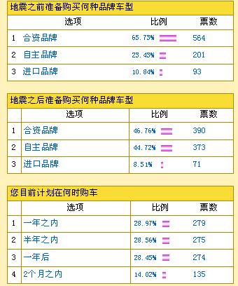 這一政策的出臺,迫使汽車企業(yè)將眼光更多的轉(zhuǎn)向私人用車市場,然而,面對災(zāi)難深重的中華大地,又有多少中國人會考慮此刻購車呢?根據(jù)最新調(diào)查顯示,42.87%的網(wǎng)友將購車計劃推遲,61.3%的網(wǎng)友認為地震之后汽車將會降價。