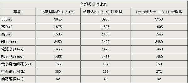 廣州豐田雅力士轎車(chē)對(duì)外宣傳的口號(hào)一貫是:“小車(chē)大空間”,但是從外觀參數(shù)的對(duì)比來(lái)看雅力士的外觀參數(shù)并不是十分的占有優(yōu)勢(shì)。三車(chē)最長(zhǎng)的數(shù)馬自達(dá)2,意味著其在腿部空間方面可能表現(xiàn)的比較好。寬度雅力士和馬自達(dá)2相同,從高度的對(duì)比數(shù)據(jù)來(lái)看,雅力士和飛度相差非常細(xì)微,這兩款車(chē)的頭部空間比較大。馬自達(dá)2的高度則是因?yàn)槠溥\(yùn)動(dòng)理念的設(shè)計(jì),車(chē)身高度低一些流線型更加的明顯。