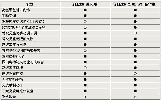 馬自達(dá)6簡(jiǎn)化版車(chē)型的內(nèi)飾雖然沿用黑色桃木內(nèi)飾風(fēng)格,但是這款車(chē)的駕駛座椅并沒(méi)有采用電動(dòng)調(diào)節(jié)和記憶功能,而座椅采用了織布材質(zhì),使整車(chē)的檔次有所降低。在音響效果方面,這款新車(chē)配備了單碟CD,喇叭的數(shù)量也減少為4個(gè),整車(chē)的音響效果降低不少。