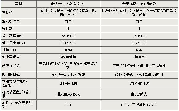 新飛度最大功率提升到73千瓦,最大扭矩也增至127牛米,動力明顯超過了雅力士的1.3L發(fā)動機.在變速器上,新飛度的五速自動擋明顯要優(yōu)越于雅力士的四速自動擋。在節(jié)油的對比上,從圖表可以看出,百公里油耗(90km/h等速)新飛度要節(jié)省于雅力士。在行車安全方面兩款車都采用了EPS電子助力轉(zhuǎn)向系統(tǒng)。