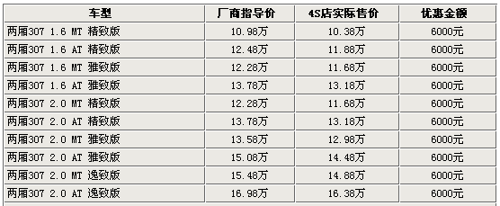 標致兩廂307與東風雪鐵龍C4屬于一個平臺的兩個產(chǎn)品,在這款車上市之后,兩廂標致307的價格也出現(xiàn)了松動。據(jù)網(wǎng)上車市價格監(jiān)測系統(tǒng)顯示:目前這款車型在北京地區(qū)東風標致4S店的最大優(yōu)惠幅度為6000元。具體情況見下表:
