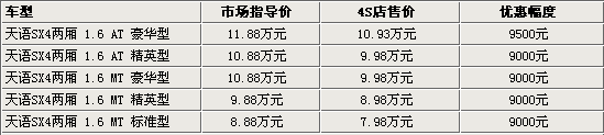 近日,記者在北京地區(qū)的長安鈴木4S店了解到,天語SX4兩廂現(xiàn)在再度出現(xiàn)高達近萬元的優(yōu)惠幅度,這個價格比前幾個月的價格又有了一定幅度的下降。具體價格可見下表: