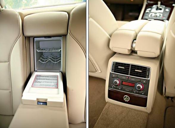 雖然都配有后排空間空調(diào)調(diào)節(jié)按鈕,但顯然A8L的功能更為強大,視覺效果也更加高檔。 位于后排座椅中央扶手后面的車載冰箱在A6L上是找不到的。
