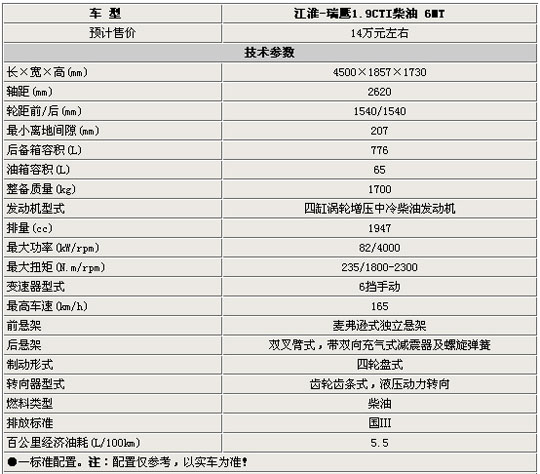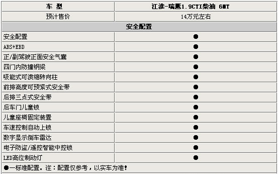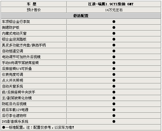 江淮瑞鷹(參數(shù)配置 圖庫)1.9CTI柴油版首次亮是在今年4月開幕的北京車展上,作為瑞鷹系列的首款柴油版車型,一經(jīng)亮相就受到了各方的廣泛關(guān)注。受種種原因的影響,預(yù)計于6月上市的計劃被迫延遲,目前得到的消息推遲到10月份前后正式上市。近期,網(wǎng)上車市網(wǎng)站在江淮汽車內(nèi)部人士處得到了該款車型的部分配置信息,一直關(guān)注的消費者朋友可以先睹為快。