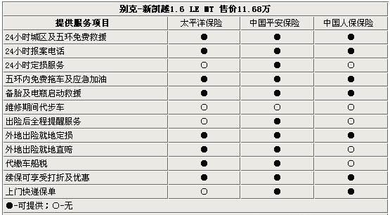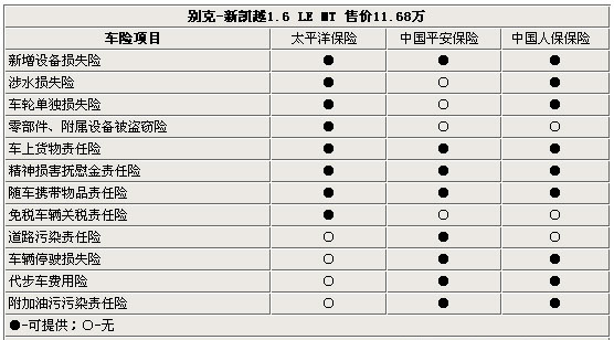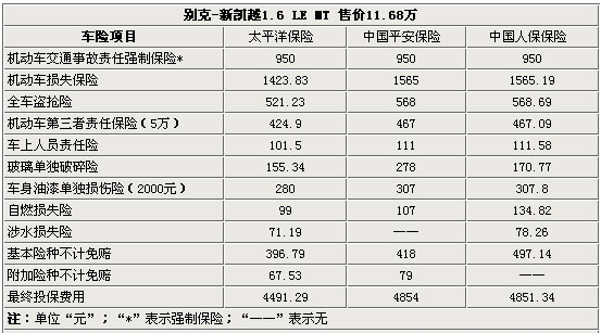 經(jīng)過多項(xiàng)改進(jìn)升級(jí)的上海通用別克新凱越正在火熱的銷售中。作為上海通用中級(jí)車的最新拳頭產(chǎn)品,新凱越不僅外型更時(shí)尚、配置更豪華,相比之下較低的定價(jià)讓“凱越”的高性價(jià)比也得以更好的延續(xù)。在購買新凱越后,如何在眾多的保險(xiǎn)公司中選擇一家為愛車投保成為了車主購車后的一個(gè)首要問題,F(xiàn)就以目前銷量相比之下較多的售價(jià)為11.68萬元新凱越1.6 LE手動(dòng)擋車型為例,將在廣西地區(qū)的太平洋、平安、中保這三家保險(xiǎn)公司的投保費(fèi)用向大家做一個(gè)簡單的介紹,以便為您在購車以及投保方面提供一定的參考。