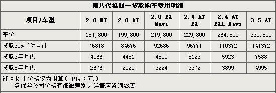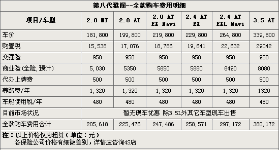 在購車時您除了需要支付車價以外,還有幾大項目時必須要支付的。例如上面表格中所列舉的,車輛購置稅、交通強制保險、養(yǎng)路費、車船使用稅都是有固定額度的。而需要您注意的就是根據(jù)自己對車輛的使用情況,您可以選擇不同種類的商業(yè)險作為輔助,例如選擇全險、3項主險、4項主險等;而在繳納養(yǎng)路費時您也可以按照月/季度/年的方式繳納,因此在購車后總計的車價就會有幾千元的差異。目前全款購車暫無現(xiàn)金優(yōu)惠,第八代雅閣除3.5L車型需要預訂外其它剩余車型在4S店內均有現(xiàn)車出售。