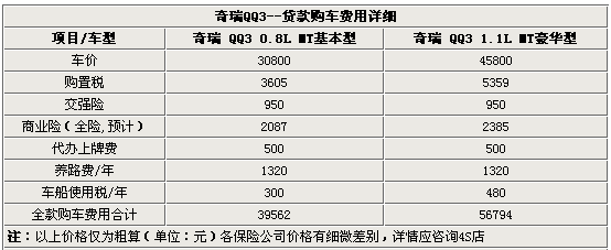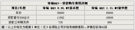 對于貸款購車消費(fèi)者而言,目前QQ3可運(yùn)作貸款的經(jīng)銷商較少,同時(shí)貸款業(yè)務(wù)也僅限個(gè)別大城市的銀行提供,所幸辦理手續(xù)時(shí)間較短,一周左右即可提車。您可享受到為期3年的按揭貸款方式,購買這款小車的首付金額總計(jì)大致在1~2萬之間,3年月還款最高僅900元左右。