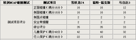 由上面歐洲NCAP安全碰撞測試成績可以看出,綜合評(píng)分最高的是雪鐵龍C4和?怂,都得到了35分。在正面碰撞測試中,由于雪鐵龍C4和福克斯對(duì)前排乘員的保護(hù)十分優(yōu)秀,所以相應(yīng)的它們也得到16分的成績。相比馬自達(dá)3對(duì)乘客的保護(hù)大部分僅達(dá)到了標(biāo)準(zhǔn)的程度,所以相應(yīng)的馬自達(dá)3僅得到12分的成績,這一點(diǎn)可以從上面的碰撞示意圖也可以看出。在側(cè)面碰撞中三款車型成績相同,均得到了18分中的16分。兒童保護(hù)雪鐵龍C4得到了42分的優(yōu)異的成績,這是在同級(jí)別車型中很少見的。而行人保護(hù)方面,三款車型分別直得到了22分、15分和15分(滿分36分),均還有很大的提升空間。