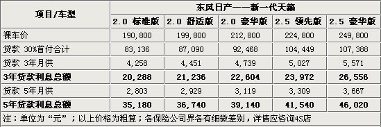 對于希望貸款購車的朋友來說,目前日產(chǎn)新一代天籟車型的貸款購車也可以正常進行。不過東風(fēng)日產(chǎn)目前還沒有自己的金融公司,所以貸款業(yè)務(wù)還是與各大銀行辦理的。以新一代天籟2.0標(biāo)準(zhǔn)版為例,售價19.08萬元,您最高可以享受到70%、3年的按揭(公務(wù)員、教師可達(dá)5年),這樣的話購買該車的首付金額總計大致在8.3萬元上下,3年月還4258元左右、5年月還2803元左右。但是3年按揭您要多還給銀行20288元貸款利息,5年則多還35180元,二年相差了近1.5元左右。