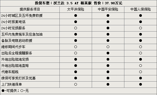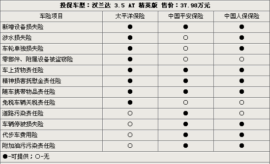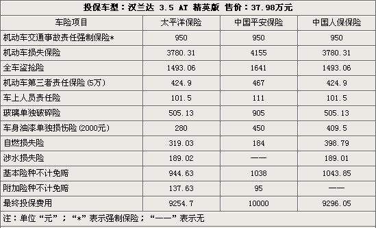 作為廣州豐田首款以整車進(jìn)口模式在國內(nèi)銷售的車型,漢蘭達(dá)登陸中國汽車市場已一年有余。在這一年中,漢蘭達(dá)(參數(shù)配置 圖庫)的供求關(guān)系一直處于緊張狀態(tài),近期這一售價為37.98-46.98萬元的車型出現(xiàn)了價格上的松動,而這也讓更多的消費(fèi)者將關(guān)注的目光投到漢蘭達(dá)身上,隨之也有越來越多的人們成為了漢蘭達(dá)的車主。在選定了車型后,如何在眾多的保險公司中選擇其一為愛車投保成為了成為了新車主們面臨的又一問題。現(xiàn)以售價為37.98萬元的豐田漢蘭達(dá)3.5L自動擋精英版車型為例,在廣西地區(qū)的太平洋、平安、中保這三家保險公司的投保費(fèi)用向大家進(jìn)行一個簡單的介紹 ,以便為消費(fèi)者購車時提供一定的參考。