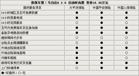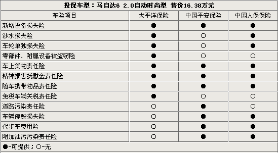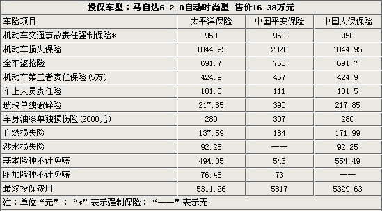 馬自達(dá)6(參數(shù)配置 圖庫(kù))作為一汽馬自達(dá)旗下的主力車型,自上市以來(lái)一直深受消費(fèi)者的喜愛。近日馬自達(dá)為進(jìn)一步加大馬自達(dá)6車系的價(jià)格區(qū)間,增強(qiáng)整體競(jìng)爭(zhēng)力而推出的兩款新車——馬自達(dá)6轎車時(shí)尚版與運(yùn)動(dòng)版轎跑車,已于2008年7月初上市銷售。對(duì)于消費(fèi)者而言,在購(gòu)?fù)贶嚭蟪松吓浦庾畲蟮囊患戮褪墙o愛車上保險(xiǎn)了,而目前市面上大大小小的保險(xiǎn)公司有幾十家,消費(fèi)者究竟要如何選擇呢?下面我們就以新馬自達(dá)6自動(dòng)時(shí)尚型為例,分別收集了目前市場(chǎng)上三家比較知名保險(xiǎn)公司的投保費(fèi)用(中國(guó)平安、中國(guó)人保、太平洋保險(xiǎn)),以便消費(fèi)者可以在提車后選擇適合自己的保險(xiǎn)公司及投保方式。