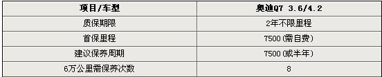正式進口的奧迪Q7包括3.6V6和4.2V8兩款引擎,目前奧迪原廠為旗下Q7車型提供了2年不限公里的質(zhì)保期限,在這段時間內(nèi)您的車輛出現(xiàn)任何質(zhì)量問題都可以遵循相應(yīng)規(guī)定到4S店進行檢測和索賠。購買該車后您的首次保養(yǎng)里程不要超過7500公里,在首保之后的每7500公里都要到4S店進行一次車輛保養(yǎng),若以總計行駛6萬公里計算共需要到4S店保養(yǎng)8次。