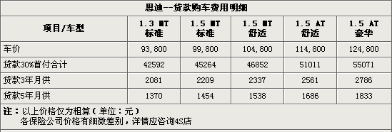 目前購置車輛大都可以按全款購買及貸款購買兩種支付方式。全款購車更加適合具備足夠購車預(yù)算的消費(fèi)者,而貸款購車更加適合希望用現(xiàn)有的錢享受更高檔次車型的消費(fèi)者。此外,把購車款的一部分資金用于投資理財(cái)也是不錯的選擇。下面我們先來看一下貸款購買思迪,您的購車總支出大致需要多少。