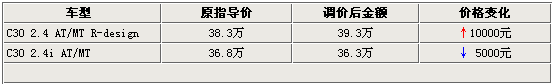 系出名門的沃爾沃C30(參數(shù)配置 圖庫)車型,憑借極富個(gè)性的整體設(shè)計(jì)以及合理的動(dòng)力性能搭配,贏得了眾多注重生活質(zhì)量及時(shí)尚樂趣的消費(fèi)者喜愛。不過據(jù)網(wǎng)上車市得到的消息,指導(dǎo)價(jià)為36.8萬的C30 2.4i車型官方調(diào)價(jià)5000元,而另一款名為R-design個(gè)性運(yùn)動(dòng)版C30在增配后,由原先的38.3萬元的指導(dǎo)價(jià)調(diào)整為39.3萬元。具體詳情如下: