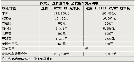 談完了貸款,我們再來聊一聊全款購車。全款購車要省去很多不必要的環(huán)節(jié)。只要繳納車款、購置稅、保險、以及其他雜費(fèi)就可以將車提回家了。上圖羅列出的就是目前全款購買速騰(參數(shù)配置 圖庫)-冠軍版車型的實(shí)際情況。在車款方面,速騰-冠軍版目前沒有任何的優(yōu)惠。受奧運(yùn)會的影響,各家4S店也均沒有現(xiàn)車進(jìn)行銷售。目前都是僅接受預(yù)定,訂金為3000-5000元。
