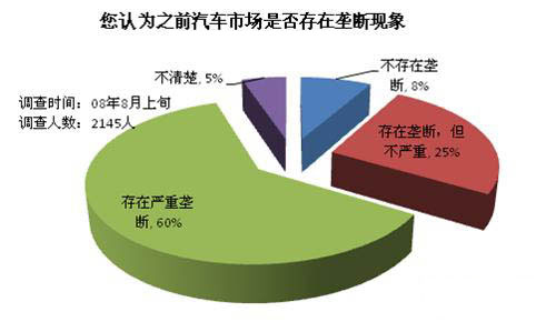 調(diào)查結(jié)果顯示,60%的消費(fèi)者認(rèn)為之前的汽車市場存在嚴(yán)重壟斷,25%的消費(fèi)者認(rèn)為之前的汽車市場存在壟斷,但是情況不嚴(yán)重。汽車市場長期存在著各種“潛規(guī)則”,《反壟斷法》的實(shí)施無疑讓汽車行業(yè)感受到了政策層面的沖擊。其中最重要的是經(jīng)銷商與汽車制造商之間的“不平等條約”將面臨巨大挑戰(zhàn)。