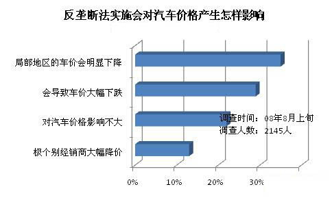 大多數(shù)消費(fèi)者認(rèn)為《反壟斷法》的實(shí)施會(huì)導(dǎo)致汽車價(jià)格的明顯下降。其中,35%的消費(fèi)者認(rèn)為局部地區(qū)的車價(jià)會(huì)明顯下降,另有29%的消費(fèi)者認(rèn)為會(huì)導(dǎo)致整體車價(jià)的大幅下跌!斗磯艛喾ā啡∠讼拗瓶鐓^(qū)銷售,以往由于供需關(guān)系或者交通方面的影響各地區(qū)車價(jià)會(huì)有一定差異,但是由于廠家限制跨區(qū)銷售,消費(fèi)者只能在當(dāng)?shù)刭徺I汽車。取消該規(guī)定后,上海的消費(fèi)者也可以到甘肅購買便宜車了,這樣局部地區(qū)的高價(jià)車也就很難出手,有利于壓低部分區(qū)域的過高車價(jià)。另外,《反壟斷法》取消了最低限價(jià)制度,只要經(jīng)銷商愿意就可以隨便降低車價(jià),激烈的市場競爭可能會(huì)導(dǎo)致車價(jià)出現(xiàn)較大幅度的下跌。