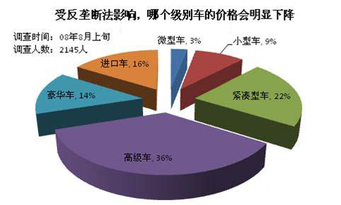 調(diào)查結(jié)果顯示,大多數(shù)消費(fèi)者認(rèn)為受反壟斷法影響高級(jí)車的市場價(jià)格會(huì)出現(xiàn)明顯下降。另有22%的消費(fèi)者認(rèn)為受影響緊湊型車的價(jià)格會(huì)大幅下降。目前市場需求量比較大的是緊湊型車和高級(jí)車,高級(jí)車的利潤空間相對(duì)較大,如果降價(jià)它的降價(jià)幅度也會(huì)相對(duì)較大。另外,高級(jí)車加價(jià)銷售的情況比較多,像之前的凱美瑞和新雅閣,新壟斷法實(shí)施后這種情況會(huì)逐漸消除。
