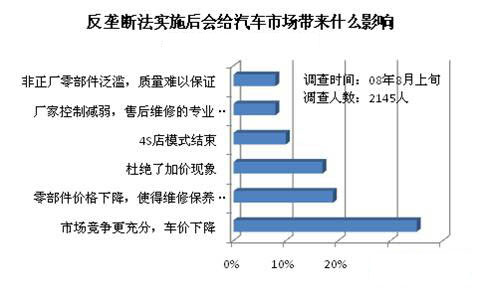 大多數(shù)消費(fèi)者認(rèn)為反壟斷法實(shí)施后會(huì)使得汽車市場競爭更充分,車價(jià)下降。近20%的消費(fèi)者認(rèn)為反壟斷法會(huì)導(dǎo)致汽車零部件價(jià)格下降,使得維修保養(yǎng)費(fèi)用降低,另有部分消費(fèi)者認(rèn)為會(huì)杜絕加價(jià)售車現(xiàn)象。只有極少數(shù)消費(fèi)者認(rèn)為反壟斷法會(huì)帶來非正廠零部件泛濫質(zhì)量難以保證,廠家控制減弱售后維修的專業(yè)性難以保證等弊端。一個(gè)法規(guī)的實(shí)施總會(huì)帶來好和不好的方面,但從調(diào)查來看,消費(fèi)者對(duì)反壟斷法還是持比較樂觀的態(tài)度,認(rèn)為它帶來的利大于弊。