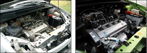 『三廂車型的1.5L發(fā)動機艙(左)和兩廂車型的1.3L發(fā)動機艙』