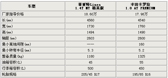 兩款車同為三廂A級轎車,菲亞特linea在車身長度和高度略占上風(fēng),但卡羅拉的車寬更具優(yōu)勢。菲亞特linea和卡羅拉的軸距均在2600mm左右,可以預(yù)計(jì)這兩款車在車內(nèi)腿部空間方面不相上下。菲亞特linea的油箱容積要小于卡羅拉,但對于經(jīng)濟(jì)型轎車來說足以滿足人們?nèi)粘9ぷ骱投掏韭糜蔚男枨蟆?/P>