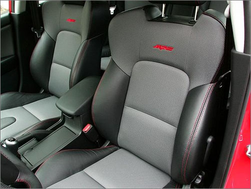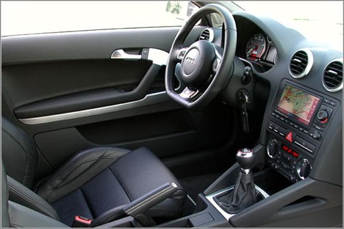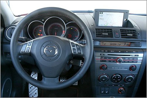 三款車的內(nèi)飾也有明顯的區(qū)別。寶馬的設計很雅致,深色的中控面板配上零星的鋁質(zhì)裝飾,總之它的內(nèi)飾最有運動感。奧迪的內(nèi)飾也同樣充滿運動氣息,真皮包裹的運動方向盤和手剎都用明顯的白線縫制,還有鋁制踏板,這些都是不可忽視的細節(jié)。馬自達3 MPS的內(nèi)飾也有鮮明的特點,黑色真皮和紅色縫線,座椅和踏板上的MPS字樣,這些都表明它不同于普通的馬自達3。儀表盤上紅色的字體和垂直的指針也有強烈的運動訴求。