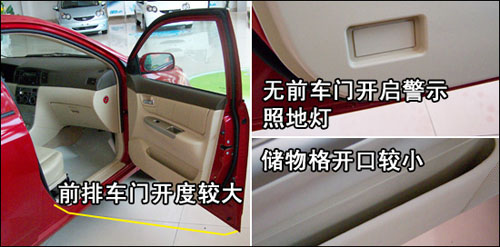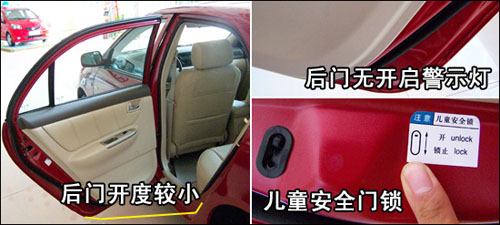 相比前門而言,后門的開度較小,身材高大的人上下車會(huì)覺得有一定的方便。撥桿式兒童安全門鎖操作容易,設(shè)計(jì)有醒目的使用提示標(biāo)簽。