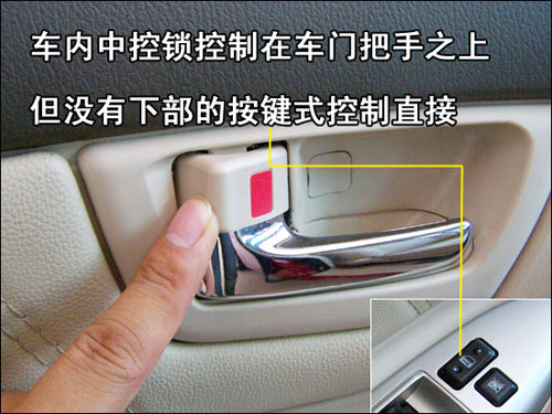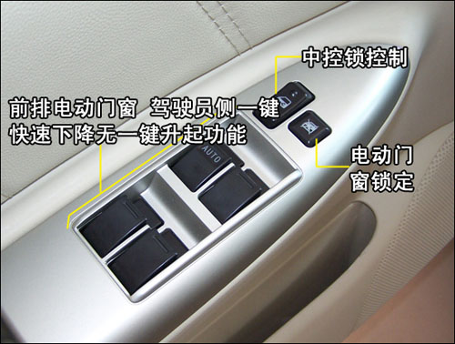 駕駛員側(cè)車門控制區(qū)僅有全車門窗控制,以及車內(nèi)中控鎖控制,而其它常見功能調(diào)節(jié)控制均在駕駛席左側(cè)。全車車窗僅駕駛員一側(cè)為“一觸式”下降,無“防夾”功能。