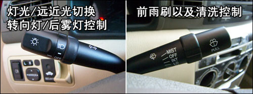 方向盤左側(cè)的控制桿控制了除了前霧燈以外幾乎全車的主要燈光系統(tǒng),前霧燈的開關則被設計在了駕駛員左側(cè)儀表臺的控制區(qū)中。右側(cè)為常見的前風擋雨刷系統(tǒng)控制,無后雨刷設計。
