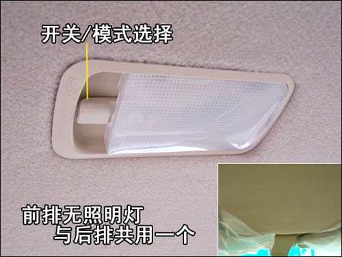 前排沒有設計照明燈,前后排共用一個。第二排照明燈在車頂中部,調(diào)節(jié)方式簡單亮度較高。方便在夜間以及光線不好的情況下給車內(nèi)照明。