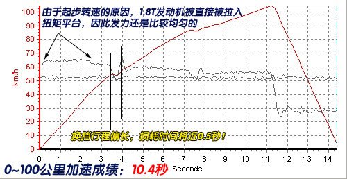 盡管起步時(shí)的動(dòng)力輸出非常充分,但超過(guò)5000rpm后(在斷油前最后的1000rpm區(qū)間)轉(zhuǎn)速爬升還是會(huì)感覺(jué)稍顯吃力,再加上擋位行程長(zhǎng)而損失的換擋時(shí)間,最終,駿捷1.8T 6MT與酷寶1.8T MT在加速成績(jī)上還是差距較大的,成績(jī)僅為10.4秒。