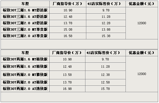 據(jù)4S店的銷售人員介紹,目前東風(fēng)標(biāo)致307兩廂和三廂車各款供貨都比較充足。消費(fèi)者現(xiàn)在購(gòu)買三廂1.6L和兩廂系列可以得到1.2萬元的降價(jià)優(yōu)惠。
