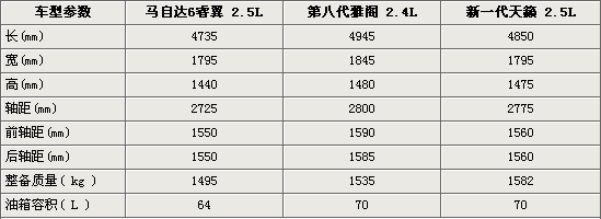 在馬自達(dá)6睿翼、雅閣與天籟這三款車型中,有著最短軸距為2725mm的睿翼在整車長度的比較中也排在最后,全車長度為4725mm,但其寬度則與天籟同為1795mm。整體比較下來,馬自達(dá)6睿翼的長/寬/高均小于第八代雅閣。相較而言,有著最輕1495kg車身重量的睿翼,在油箱容積方面也次于同為70L的雅閣與天籟。