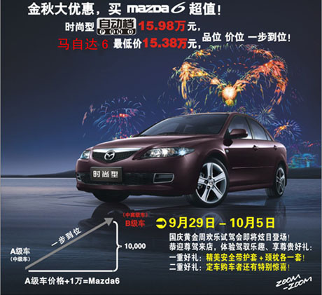 一汽馬自達6價格一再優(yōu)惠,前段時間直降2萬讓馬自達6得已笑傲中級車市。目前,在國慶期間,鑫廣達一汽馬自達4S店再出重手,兩款車型讓利高達6000元,馬自達6最低價僅售15.38萬元,而自動擋時尚型僅售15.98萬元。以下是該店的促銷信息