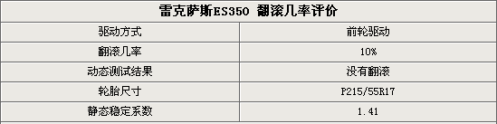 在翻滾可能性評價中雷克薩斯ES350沒有出現(xiàn)翻滾。測試結(jié)果表明,采用前輪驅(qū)動配備17寸輪胎的雷克薩斯ES350翻滾幾率為10%,而靜態(tài)穩(wěn)定系數(shù)則為1.41,最終雷克薩斯ES350在翻滾測試中獲得了5顆星的評價,該評價在乘用車中屬于上等水平。