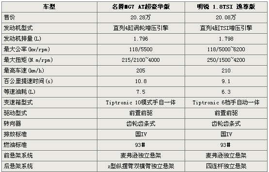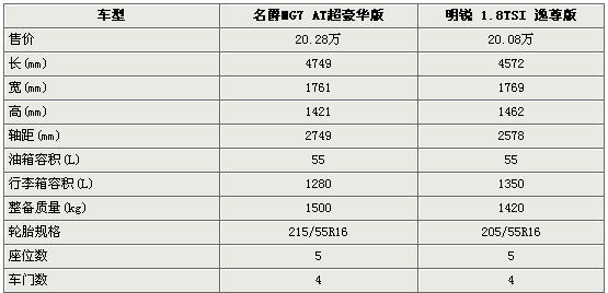 相比兩車的外形及尺寸,剛剛上市的AT版名爵MG7在軸距及整車長度上均有優(yōu)勢,而明銳則在車身寬度及高度方面面擁有更多空間。而在其他方面的比較中,除MG7的車體較明銳要重80KG外,基本沒有太多區(qū)別,兩車均表現(xiàn)良好。