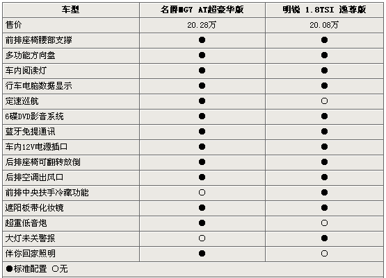 在兩款均注重休閑特質的車型內,可以發(fā)現(xiàn)眾多的舒適配置,同時兩車基本滿足了中級車的時尚與周到,并可應付較為復雜的路面要求,高端配置不多但實用性較強。除此以外,兩車分別注重不同的舒適層面,更可令駕乘者感受到不同的完美體驗。明銳的中央扶手冷藏設計增添了夏季的涼爽,而MG7的自動巡航則令每次的長途旅行變得更為輕松。