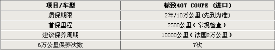 正式引入中國(guó)地區(qū)的標(biāo)致407Coupe搭載是3.0升V6發(fā)動(dòng)機(jī)。目前法國(guó)標(biāo)致原廠為旗下標(biāo)致407Coupe車型提供了2年10萬(wàn)公里的質(zhì)保期限,在這段時(shí)間內(nèi)您的車輛出現(xiàn)任何質(zhì)量問題都可以遵循相應(yīng)規(guī)定到4S店進(jìn)行檢測(cè)和索賠。購(gòu)買該車后您的首次保養(yǎng)里程不要超過(guò)2500公里,此次保養(yǎng)只是進(jìn)行一些常規(guī)檢查。在首保之后的每10000公里都要到4S店進(jìn)行一次車輛保養(yǎng),若以總計(jì)行駛6萬(wàn)公里計(jì)算共需要到4S店保養(yǎng)7次。標(biāo)致407Coupe在法國(guó)地區(qū)保養(yǎng)歷程為2萬(wàn)公里,但中國(guó)路況較差所以保養(yǎng)歷程縮短至1萬(wàn)公里。