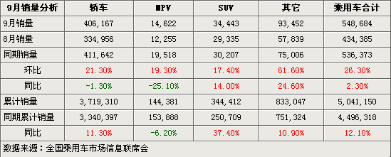 據(jù)全國(guó)乘用車(chē)市場(chǎng)信息聯(lián)席會(huì)統(tǒng)計(jì)的數(shù)據(jù)顯示,在2008年北京奧運(yùn)會(huì)及殘奧會(huì)閉幕后,消費(fèi)者購(gòu)車(chē)熱情逐漸回溫的情況下,國(guó)內(nèi)乘用車(chē)在2008年9月份的產(chǎn)量與銷(xiāo)量均有小幅回升,同時(shí)環(huán)比與同比也出現(xiàn)了不同程度的增長(zhǎng)。
