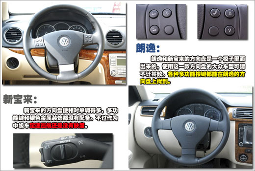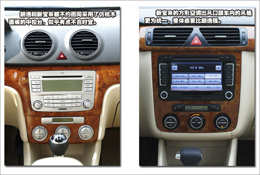 朗逸和新寶來的內飾基調一致,主要的差別在仿桃木面板的形狀、空調出風口和音響面板的色調?紤]到目標客戶的年齡區(qū)域,兩者都采用了大面積的仿桃木裝飾,美觀與否見仁見智,但對比起來的話筆者認為新寶來的黑色音響面板跟仿桃木裝飾更為協(xié)調。